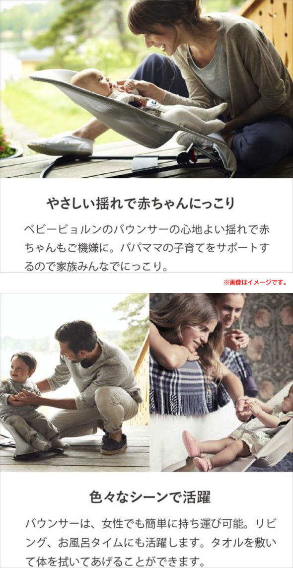 【商品特長】 ◆フルメッシュで通気性が良く、立体的に裁断されたカバーで赤ちゃんの体をしっかりと包み込みます。 ◆独自のカーブでデザインされたフレームは非常に優しい揺れを生み出し、生後1ヶ月からのお子様の特等席なります。 ◆バウンサーバランスソフトのやさしい揺れは赤ちゃんを心地よくあやします。 ◆電動ではなく、赤ちゃんの小さな動きがそのまま本体に伝わり、自然な心地よい揺れを与えてくれます。 ◆慣れると赤ちゃんが思いのままに揺らすことができ、さらにごきげんに。 ◆3段階にリクライニングできるので生活に合わせて使用できます。 ◆お子様が立てるくらいに成長すればカバーを裏返して、イスとしても使用できます。 ◆フレームの裏側には滑り止めのゴムが全面についているので、床を傷つけず、音も静か。 ◆折りたたみも出来て、持ち運びもできるので、帰省やちょっとした旅行にも便利です。 ◆カバー部分は取り外して、洗濯機で洗えます。 | |||||||||||||||||