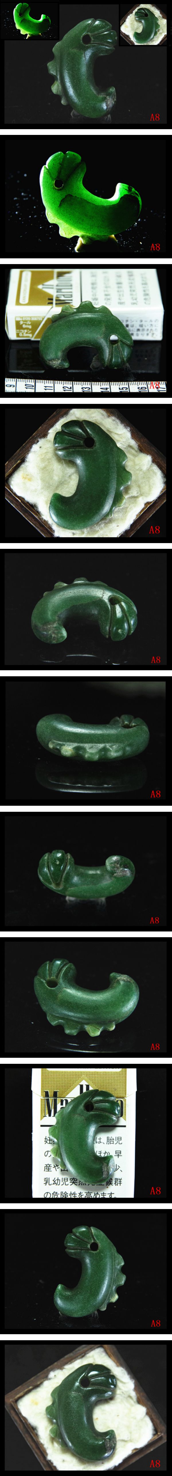 【A8】古墳期★透光性抜群表面肌艶良く濃緑色★上古玉製★極希少迫力特大背鰭付き丁字頭獣首形勾玉★検★縄文出土器祭祀具法具仏像原石 收藏