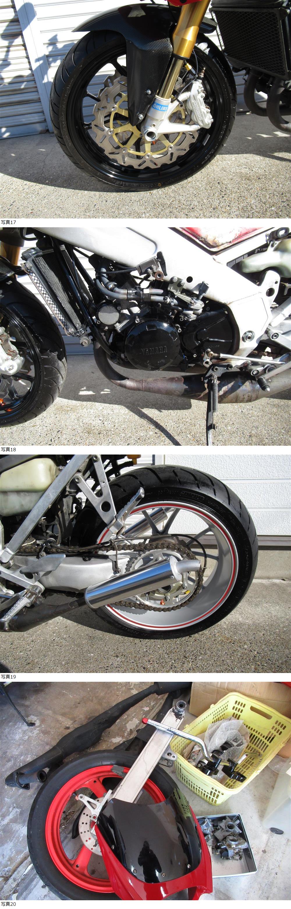 | 商品説明 | ヤマハ TZR250 の出品です☆ 埼玉の旧車、RZ専門の有名ショップにて足回り前後カスタムで 足まりだけでカスタム費用は70万円ほどかけております。☆ □フロントフォークまわり ドゥカティモンスター1100RS オーリンズ □ドカティ 848EVO ブレーキ、リヤホイール □RVF400 NC35 プロアーム □アラシ 新品フロントディスク □フロントブレンボラジアルブレーキマスター フロントタイヤ DUNLOP SPORTMAX ROADSMARTⅢ 2021年13週目製造 9.8部山 フロントタイヤサイズ:120/60ZR17 フロントホイール17×3.50 リヤタイヤ DUNLOP SPORTMAX ROADSMARTⅢ 2021年13週目製造 9.8部山 リヤタイヤサイズ:160/60ZR/17 リヤホイール17×5.50 エンジンの始動動画は2021年6月時点のカスタム前ですが、下記にありますので、ご検討中の方はよければご確認ください。☆ 商品詳細 メーカー:ヤマハ 車名:TZR250 車体番号:1KT-053※※※ 型式:1KT 原動機型式:1KT 登録書類:有(軽自動車届出済証返納証明書) 自賠責保険:有(令和8年8月) 走行距離:社外メーター交換のため不明 エンジン;キッククランキングOK 状態:現状車 鍵×1本(メイン、タンク、シート同一) ☆☆☆TZR250カスタム前 エンジン始動動画はこちら☆☆☆ ☆☆☆TZR250カスタム前 エンジン始動動画はこちら☆☆☆ ※動画はグーグルでパソコンでご確認ください。 元々実動でしたが、エンジンはRZV500Rに載せ替え予定でエンジンが見つからなく諦めたカスタム途中の個体になります。 しばらくエンジンはかけていない状態で現状かかりそうでかからない状態です。外装もタンクを含め交換予定のままの現状です。 付属品あります、純正チャンバー、りやまわり、ハンドル、リヤサス、キャブ、ビキニカウルなどです。すべて引き渡しさせて頂きます。 付属品は写真以外はありません。 全体的に経年劣化、きず、さびなど多々あります。☆ かんたんにしかチェックしていません。現状有姿渡しでの出品になります。レストアベースでの出品になります。☆ |