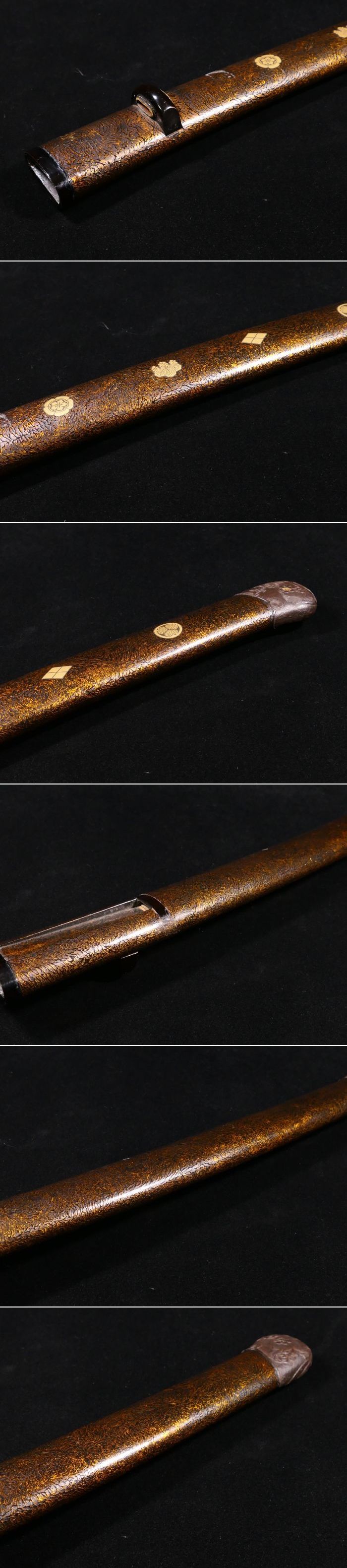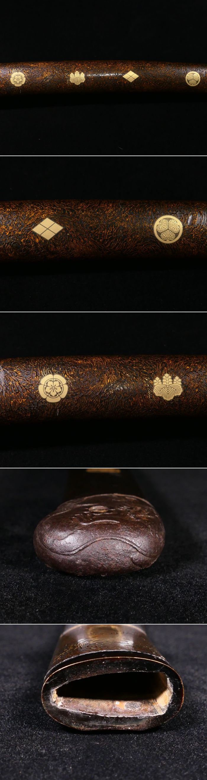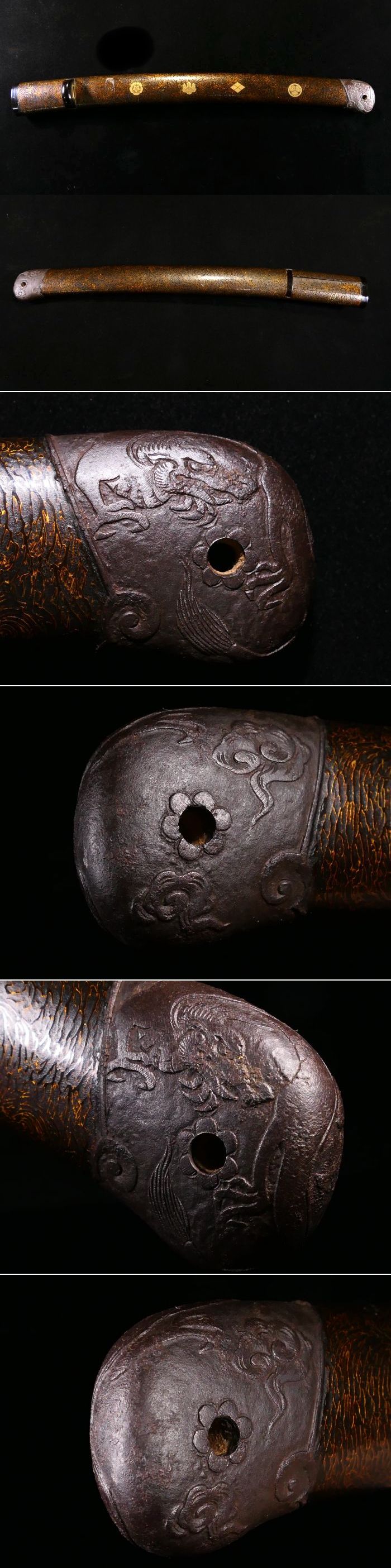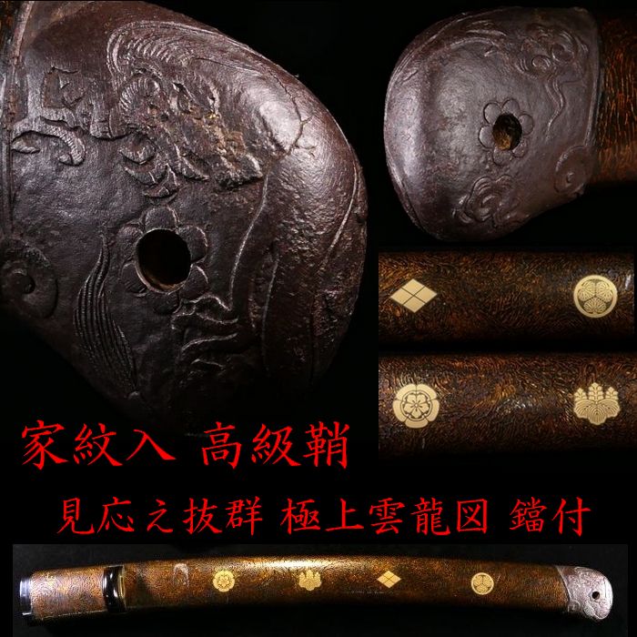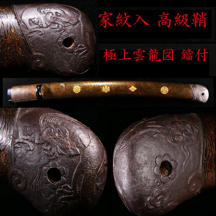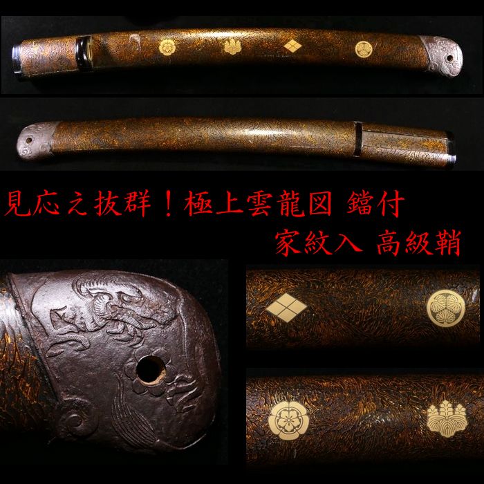 | 商品説明 | 御覧の様な造りの良い鞘です。 金色鮮やかな家紋に加え 繊細で力強き彫りの 眼光鋭く睨みを利かせる 大迫力の雲龍図が施された 見応え抜群の鐺が装着されております。 ここまでの作品ですので 審査に出すのが楽しみな 無銘の名作と言える鐺でございます。 画像にてご確認下さい。 鞘に目立った傷みはなく、状態は概ね良好です。 拵えのパーツに必要な方、如何でしょうか。 状態等、詳しくは画像にてご判断下さい。 |