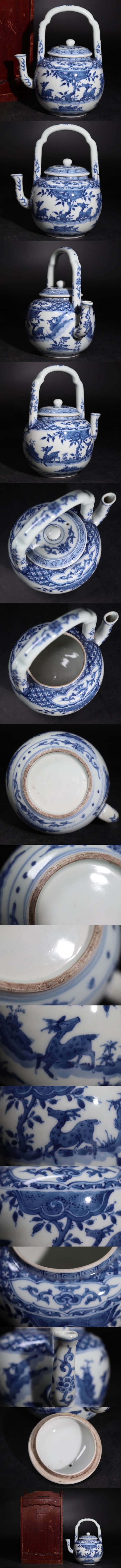 | 時代 染付 鹿文 急須 木箱付 / 中国美術 清 新渡 祥瑞 茶器 煎茶道具 .G3451 |