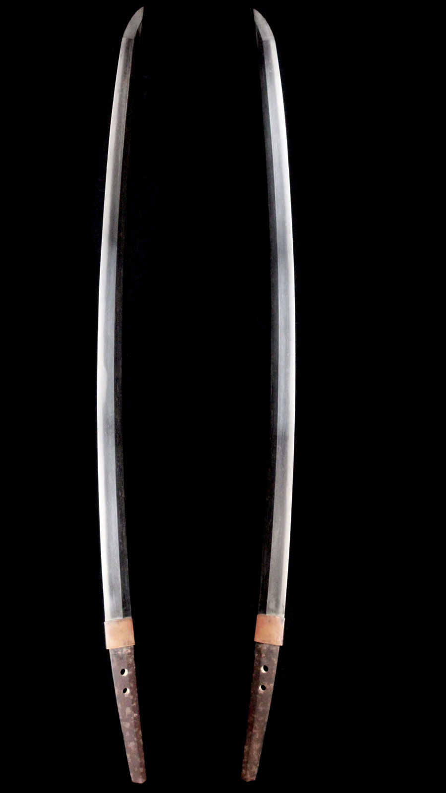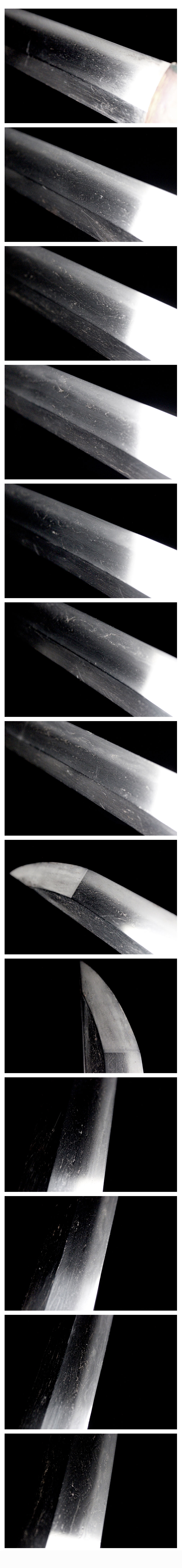 刀身長:約67.6cm 反り:約1.8cm 目くぎ穴:2個 元幅:約30.9mm 元重:約8.2mm 先幅:約21.6mm 先重:約5.1mm 刀身重:約836g 棟:庵棟 ハバキ:銅 |