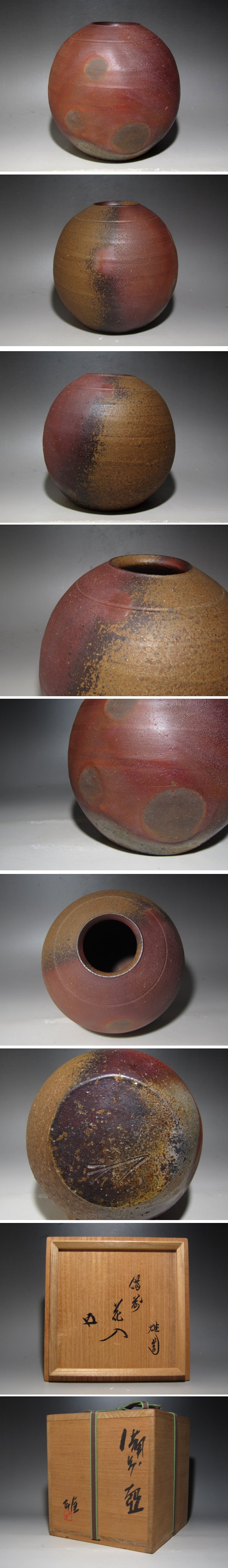 人間国宝藤原雄作の備前花入です。 備前焼ならではの質感や色合いが味わい深い風格のある逸品です。 箱蓋裏に裏千家十五世鵬雲斎の花押があります。 【藤原雄(ふじわらゆう) 1932-2001】 人間国宝藤原啓の長男。 備前焼の伝統を重んじながらも、新しい感性に溢れた作品作りを追求した。 1996年人間国宝に認定。 サイズ 直径18.5cm/高さ18cm(多少の誤差はお許しください) 状態 一見して疵やヒビ・直しは見られません。 骨董品という事をご勘案頂き、時代経過のスレや、小さな傷がある場合があるかもしれませんのでご承知置きください。 | |||