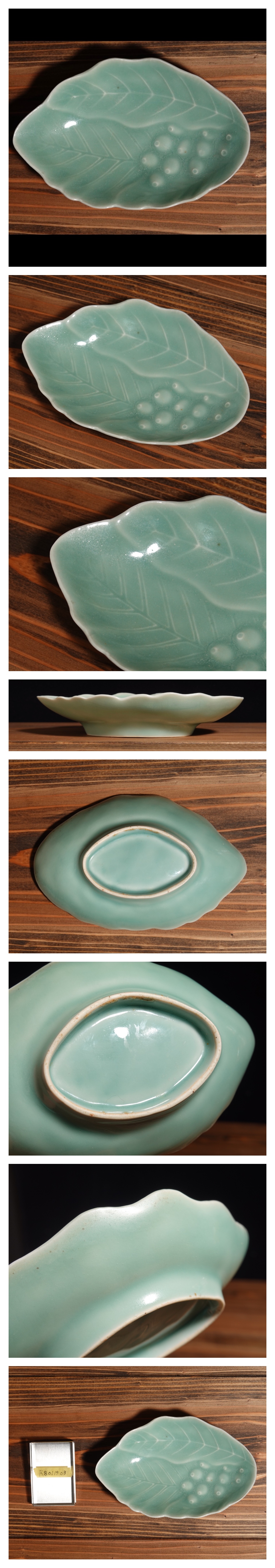 【聖陽堂】江戸時代 後期 鍋島藩窯 『 青磁 鞘豆文 陽刻 葉形 変形皿 』 小皿 鍋島青磁 図録同手掲載 【向付 取皿 銘々皿】 r8 0114 03 收藏