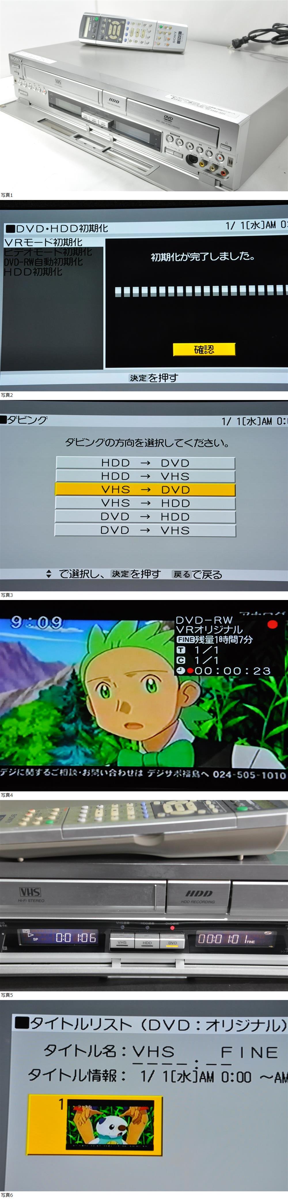 | 第6回★新春☆大放出祭★ 【商品案内】 ★商品型番:RDr-VH80 ★出品前チェック:コピーガードのかかってないものを前提としています。 VHSテープ再生○ DVD再生○ HDD再生○ VHS→DVDダビング○(手持ちのDVD-RWにて検証済み) リモコン動作::リモコン上部(電源、ドライブ切り替えなど)あたりが反応しませんでした。メニュー操作ボタンなどから下は操作可能。リモコンはおまけ程度としてご検討ください。 ★付属品:リモコン ★説明書はネットで【RDR-VH80】と型番検索するとPDFで見ることができます。 ★当方の出品物は全て電源コード付いてますのでご安心ください。 ★全体評価(あくまで主観によるもの):人気のダビング可能な一体型ビデオデッキです。外観は綺麗な状態と評価、デッキフェイスにおいても綺麗な状態と評価。リモコンも綺麗な状態です。地デジ対応ではありませんがVHS-DVD-HDD双方向へのダビングが可能なモデルとなっており、広範囲な使用目的に対応しております。操作に自信のある方にオススメです。動作確認中の写真も掲載いたします。操作においてのサポートなどはしていませんので落札者側で対応お願いいたします。 ★タイトルの状態評価はデッキフェイスを主体としており、天板やデッキ内部は加味しておりません。 ★到着後、古いテープをいきなり再生すると(テープが古く劣化していたりカビ、べたつきがあるテープ)ヘッドが正常に回らずテープが内部で絡むことがありますのでご承知おきください。 【入札する方へ】 ●評価が新規または5以下の方→落札後24時間以内のご連絡と3日以内のご入金を必須。 ●上記期限を過ぎた場合は削除になります。 ●入札後の取り消し依頼には対応していません。 ●落札後、円滑な取引がない場合は削除対象になります。 【返品返金について 必ずお読みください】 このオークションはノークレ、ノーリタではなく下記のとおりの対応をしています。★全額返金ではないですが全く返金されないよりはリスクが軽い★と理解できる方のみご入札ください。 短時間かつ簡単な確認による中古品の個人出品ですので輸送状況及び操作の上での不具合があるかもしれません。保証は一切ございません。更に到着してからの再生、録画等(テープ絡まりや映像の乱れ)についても責任が持てませんので明記しておきます。また入札者様はその明記されてるリスクに同意されて入札したこととなります。 ★返金・返品に関する重要事項★ 【商品記載と異なる不具合の場合】※電源入らない、再生できない 1.商品到着後3日以内のご連絡 2.商品を落札者様から送料ご負担の上、返送。(返品時の送料は落札者様) 3.到着後ご指定の口座へ商品落札金額から20%を差し引いた金額(全額返金ではありません)+「初回送料」を返金(つまり発送時の送料は当方負担)いたします。 出品には動作確認を行い十分気をつけていますが機械という特性上、リスクがあることにご了承願います。 【再生確認は確認できたが返品したい場合】※録画、ダビングができない 1.商品到着後3日以内のご連絡 2.商品を落札者様から送料ご負担の上、返送。 3.到着後ご指定の口座へ商品落札金額から20%を差し引いた金額(全額返金ではありません)を返金。(つまり往復の送料は落札者負担になります) 上記以外は受け付けませんので同意できない場合は他のオークションへご参加くださいませ。 【評価について】 ●当方からは評価はいれていません。評価をしてくださった方に「同じ」評価をお返しいたします。 ●いきなりの悪い評価を付けられた場合は、当方も同じ評価を入れます。 ●いきなりの悪い評価を付けられた場合は、返品返金にも応じません。 ★★★★ビデオデッキを落札された方へ★★★★ ■冬季は「つゆつき」という現象が発生しやすい時期です。 寒い外から暖かい室内へと運ばれた商品は、温度差や湿度差によって機械に「つゆつき」(機械が一時的に湿気を帯びて曇る)が発生する場合が多くあります。つゆつきが発生しているときに作動させると、テープの巻きこみや機器の誤作動が起こりやすくなります。商品お受け取り後は、半日程度室温に慣らしてから作動するようお願いをいたします。当方はジャンク品を動作品として出品することは絶対にありません。 また、誤作動が万が一、発生した場合にはいきなりデッキの故障と思わないで電源コンセントを抜いてしばらく放置すると正常に動作する場合もありますのでご案内します。 ★★★★DVD付デッキを落札された方へ★★★★ ■稀にDVDトレイが開かない場合について 当方で動作確認時に正常にトレーが開閉していても、到着後にトレーが開かない場合が稀にあります。この原因はトレーを開閉する部分にゴムベルトが使用されていて、それが空回りして開かない場合や劣化していて開かない場合、冬季には気温や湿度で軟性がなくなりうまく作動しないなど要因がいくつかあります。万が一この症状に遭遇してしまった場合は慌てずにトレーフ