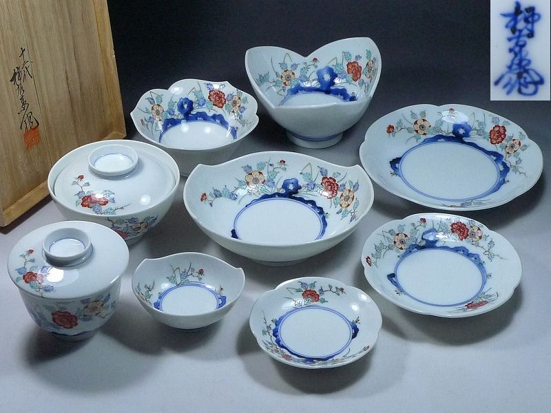 有田焼 十二代 酒井田柿右衛門造 染錦岩牡丹画 揃物 平皿・蓋付飯碗・鉢他 9点まとめて 和食器 蓋物 小皿 盛皿 醤油皿 木箱付き