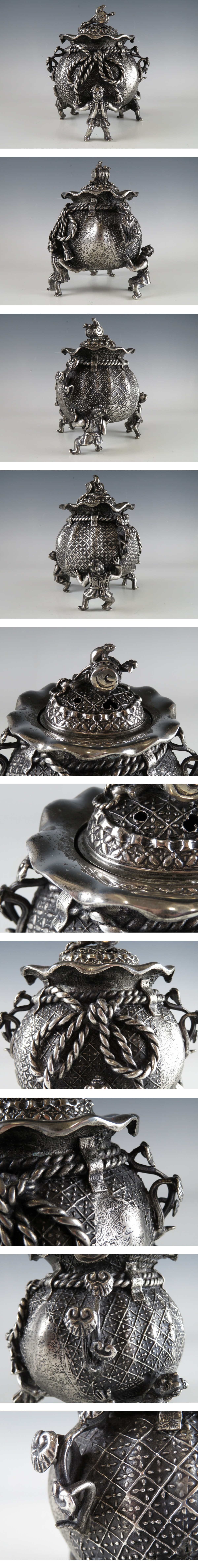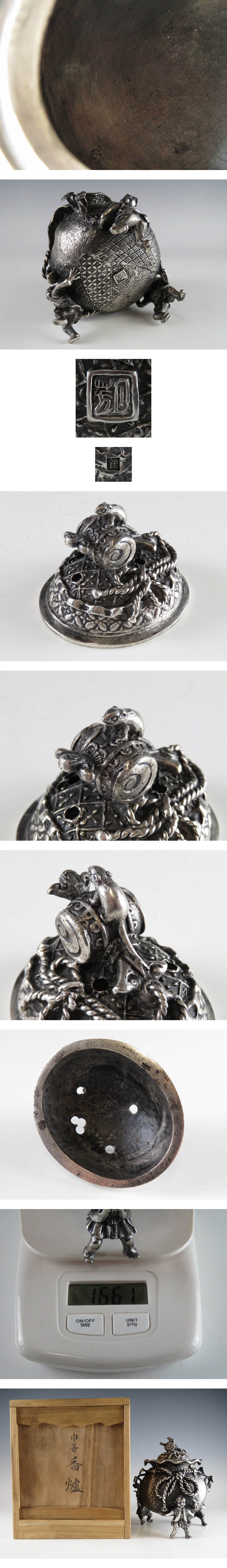 | ☆ 仏教美術 銀刻印 須賀 月芳 巾着 三足 香炉 約 1.6 kg になります。 ※ 素材については銀の刻印は御座いますが、鑑定を行っていない為に純度は不明です。あらゆる可能性を考慮の上、ご納得頂きオークションご参加下さい。 |
