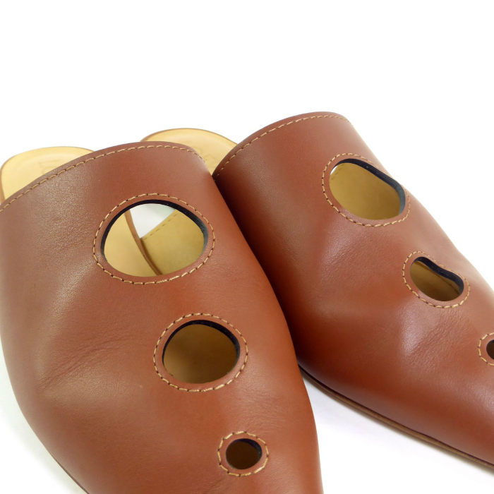 | ロエベのレザーミュール。 アッパーには3つの穴が施されており、ポインテッドトゥと相まって、女性らしさを演出してくれます。 フラットに近いローヒールで履きやすく、きれいめからカジュアルまで使いやすいお品物となっております。 |
