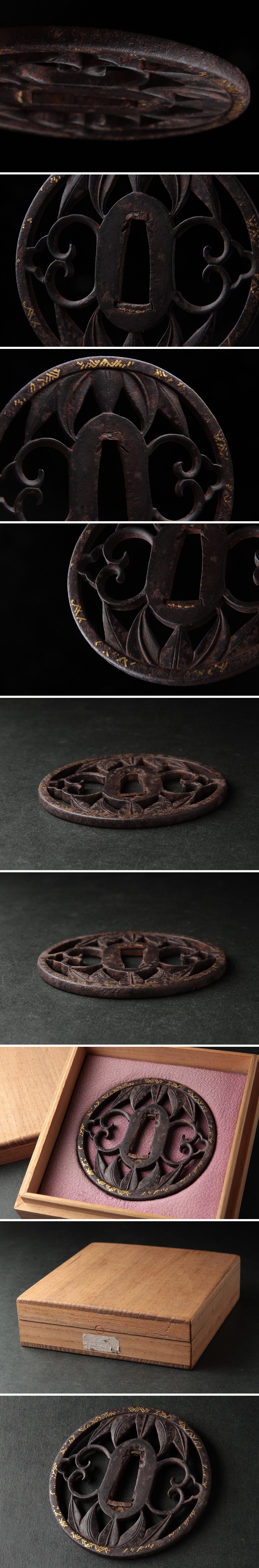 | ◆ 時代刀装具 無銘 鉄地 金象嵌 笹 雲板 透鍔 径7.8cm 木箱附・鉄透鍔・鉄鐔・古鍔 武具 古金工 古美術 小道具 ◆