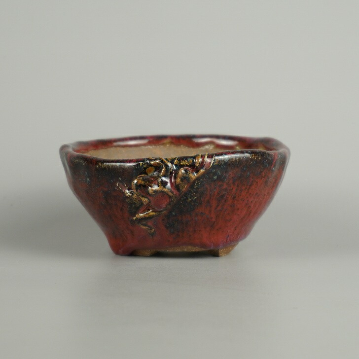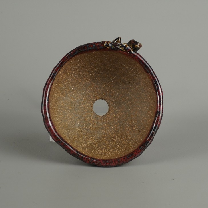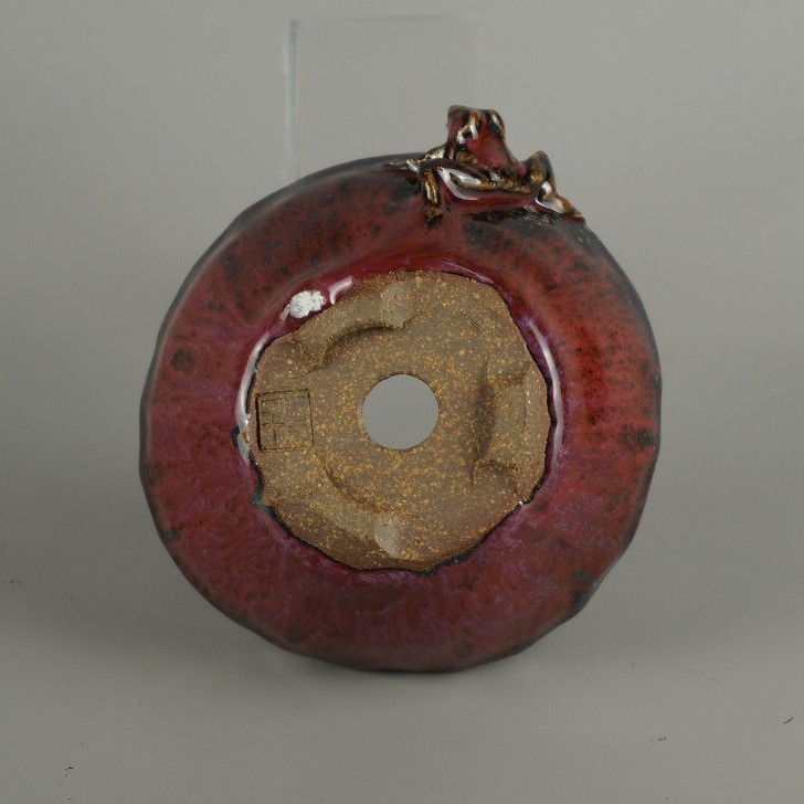 【中古】盆栽鉢 豊千 小型 長辺 約 10.5cm 丸鉢 蛙付 かえる カエル 釉薬 現品 中古鉢 收藏
