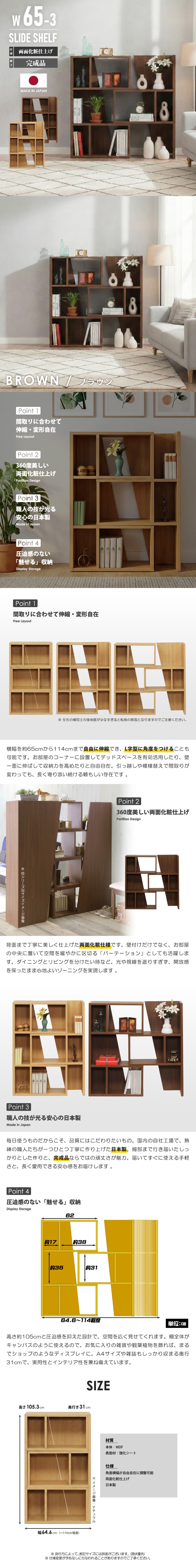 スライド シェルフ 3段 幅65cm 日本製 完成品 伸縮 コーナー ラック 本棚 オープンラック ブラウン 收藏