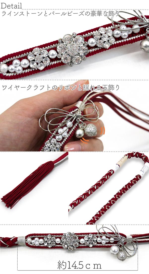 絹100%の帯締めに、ラインストーンやパール、ワイヤークラフトのリボン飾り、揺れる玉飾りをあしらい、帯元にさりげない華やぎを添えます。