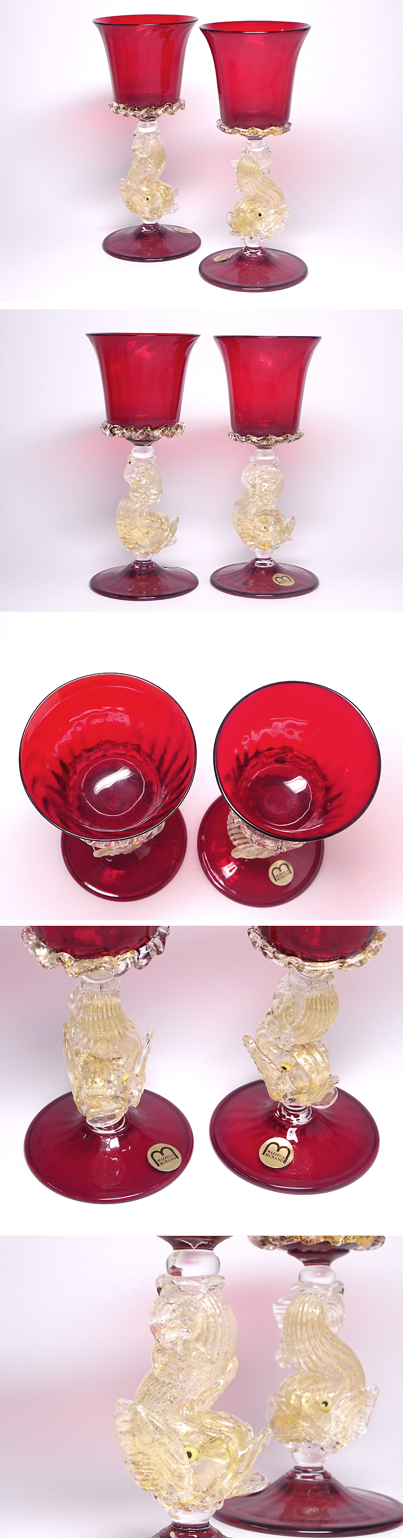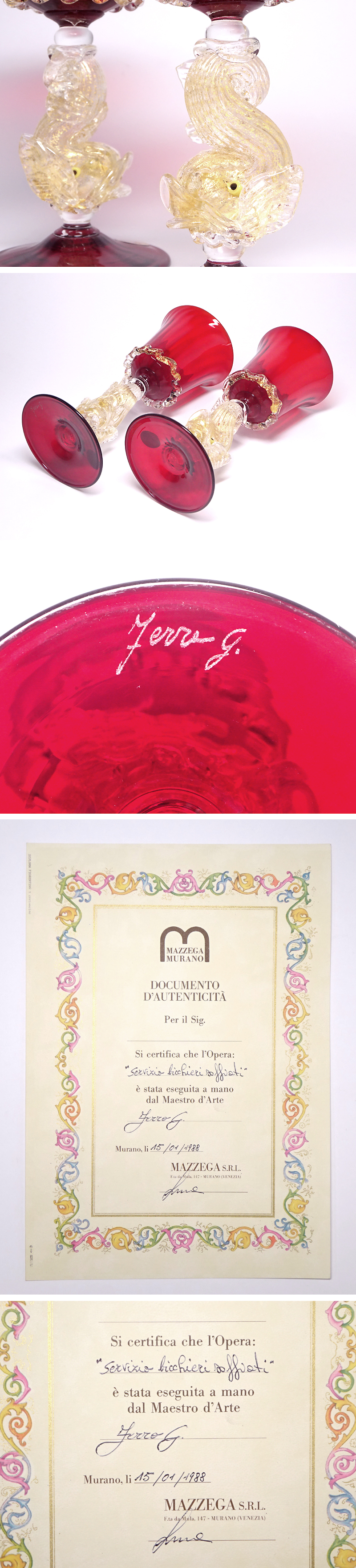 慶應◆イタリア 高級ムラノガラスの老舗【MAZZEGA MURANO】取扱品 銅赤ガラスリキュールグラス 金彩ドルフィンステム ペア 証明書付f2 收藏