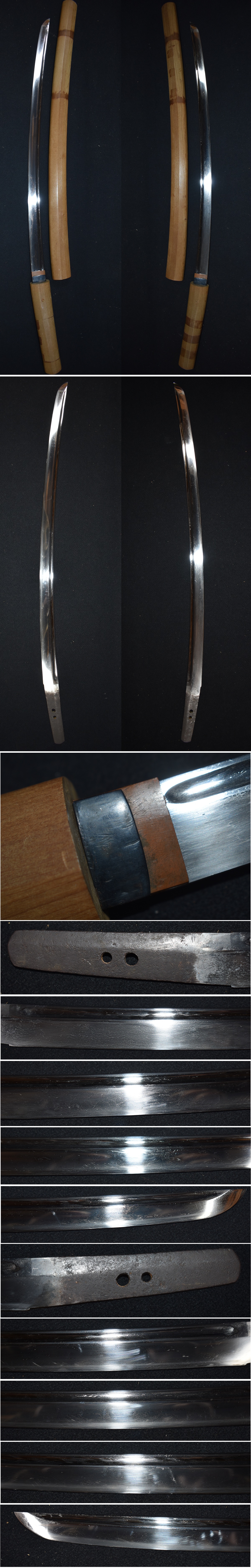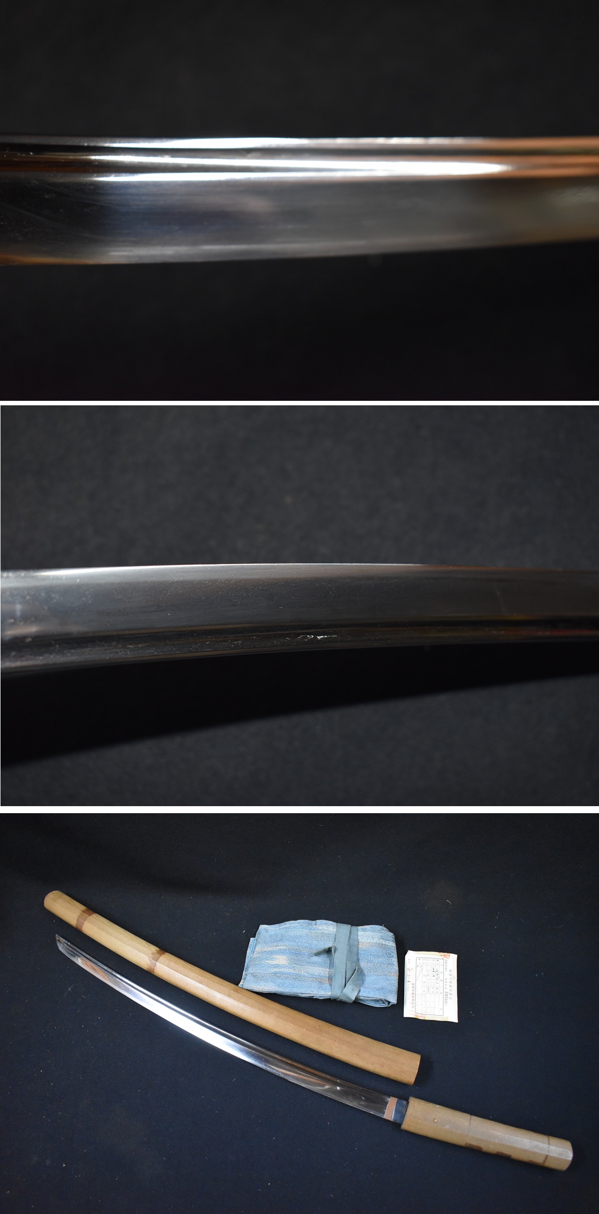ご覧頂きありがとうございます。今回出品する品は写真の脇差です。 銃砲刀剣類登録証番号 愛媛県 第34860号 種別 わきざし 長さ 55.5センチ 反り 1.7センチ 目くぎ穴 2個 元幅約2.9センチ 元重約0.7センチ 先幅約1.8センチ 在銘 無銘 古刀期の備前刀です。片手打ちの長脇差で、茎は備前特有のぼってりとした茎です。棒樋が入り、鎬 造りです。 備前刀の古刀は棒樋が多くあり、姿やバランスもいいです。初だし品の為に擦れはありますが、刃こ ぼれやハギレは無いです。切っ先も小さく古刀期の形状です。 あとは写真と画像を見て判断してください。質問はわかる範囲でお答えしますので、入札前にお願い いたします。 発送はゆうパックの着払いです。 ※注意事項※落札しましたら、登録のある教育委員会に所有者変更届(名義変更)を出してください。 よろしくお願いいたします。 |