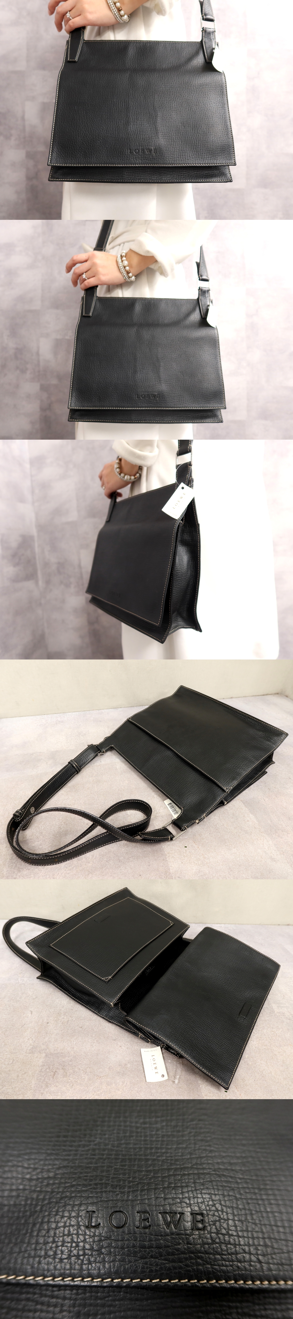 ●超美品●LOEWE ロエベ●ロゴ型押し●カーフ レザー 本革●ショルダー バッグ●黒●シルバー金具●肩掛け●B5 書類 収納 かばん●Js66206 收藏