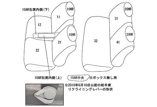 | 適合形状 | 運転席シートヒータ装備車・未装備車共に対応 2WD/4WD共に可 ※初年度登録が2019年6月付近の車両は、 シートレイアウトに載せている助手席リクライニングレバーの形状をよくご確認ください。 2019年6月17日の一部改良後・発売モデルから助手席リクライニングレバーの形状が変更されており、 変更後はES-0628に適合します。 | ||