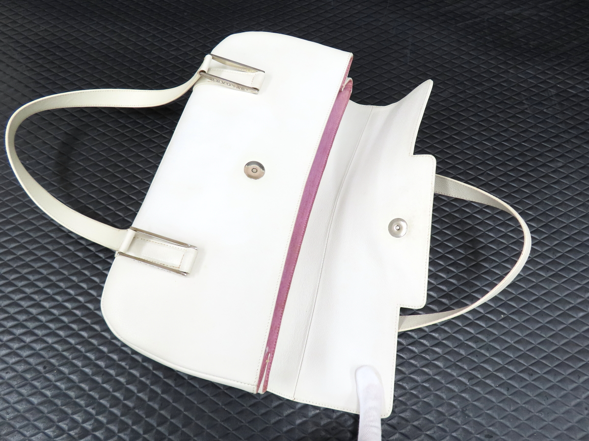 ◆美品◆BVLGARI ブルガリ◆カーフ レザー 本革◆ハンド バッグ◆ホワイト シルバー金具◆フラップ◆ロゴプレート◆腕掛け◆A16873 收藏